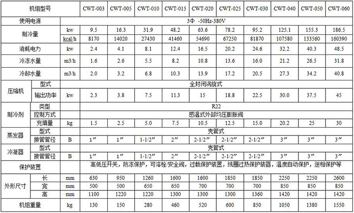 注:1.以上规格参数能力的测定工况:冷冻水入口温度12℃,出口温度7℃,冷却水入口温度30℃,出口温度35℃;